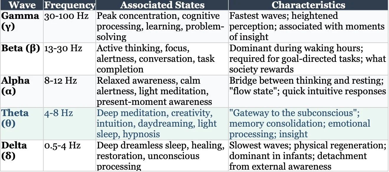 But here's what the deficit framing misses entirely: theta brainwaves are associated with deep relaxation, dreaming, meditation, and hypnosis. They're considered "the gateway to the subconscious." Theta states allow greater access to memories, intuition, creativity, and the kind of insight that emerges when we stop trying so hard.